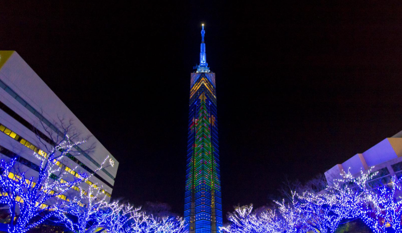 タワーの外観は、夜になると8,000枚ものハーフミラーに埋め込まれたLED照明によって幻想的に光り輝きます。季節やイベントに合わせたイルミネーションは、シーズンごとに異なる顔を見せ、訪れるたびに新鮮な驚きと感動を届けてくれます。たとえばクリスマスには雪の結晶、七夕には天の川など、テーマに合わせた光の演出もロマンティックな雰囲気を盛り上げてくれます。