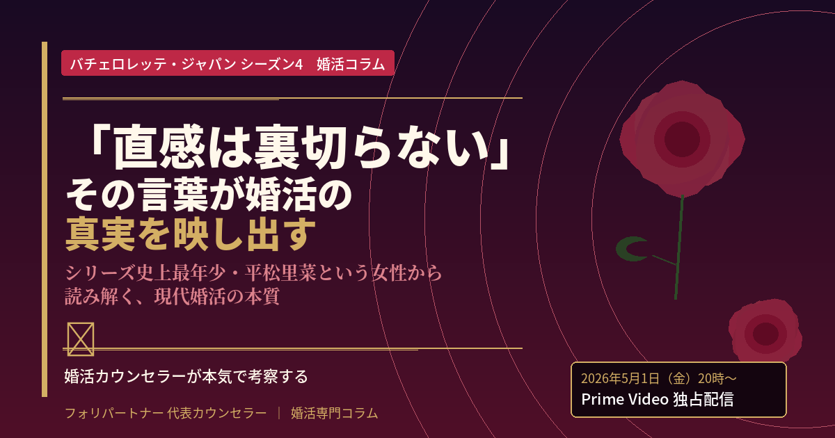 私がこのシリーズを毎回欠かさず視聴しているのは、単なる娯楽としてではない。婚活カウンセラーとして20年以上、数えきれないほどの男女の恋愛・結婚を伴走してきた立場から言わせていただくと、このシリーズは「現代日本の恋愛観の縮図」として非常に質の高い教材なのである。